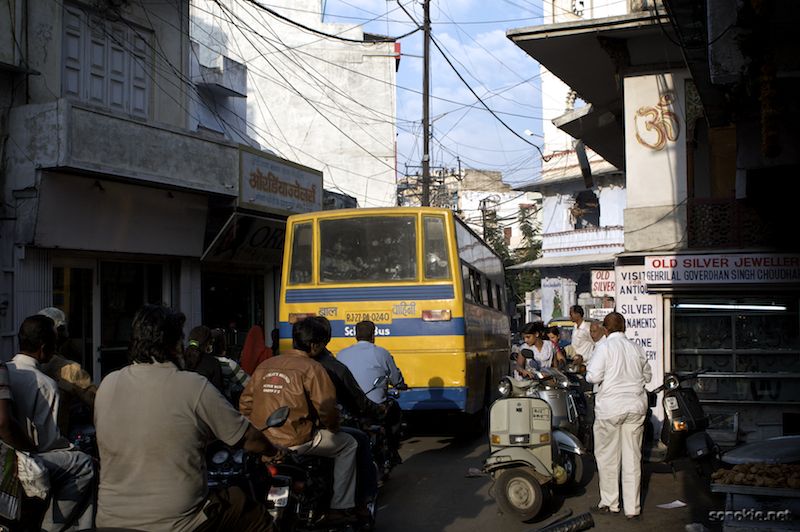 How do you get a big bus down a narrow street? Turns out you just drive it and people will make way.