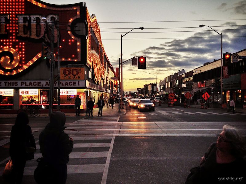 The sun sets on Bloor Street while I walk back to the hotel after meeting with my coworkers. We all work from home, then get together a couple times a year in person to discuss how to improve our processes. I look forward to the trip because my coworkers are good people, and I enjoy visiting Toronto too.