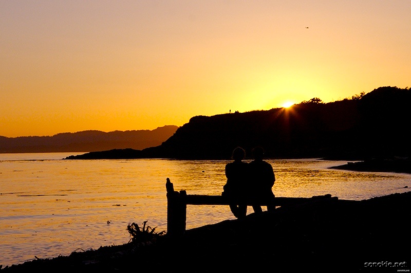 This is a decent shot of two people admiring the sunset, except that their heads are cut off by the land.