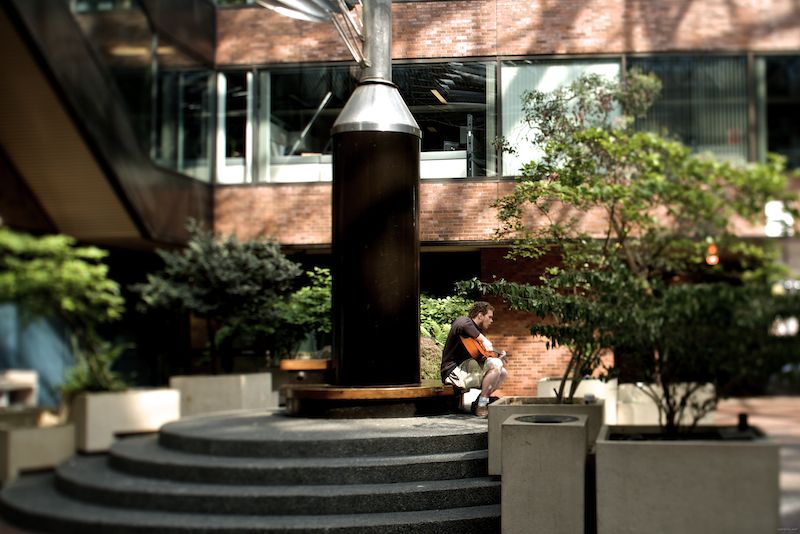 A guitarist in the library courtyard. A different day, I took my laptop to the library to work just for a change of scenery. I was watching a guy think about stealing bikes (or perhaps stuff off bikes) until his lady friend noticed me staring at them, then she dragged him away. Later someone sat next to me and told me their crazy (err.. interesting) ideas about computer or politics or something. I'm opinionated, thick-skinned and easily-amused, so it was entertaining. In a way, it was more fun than working from home, but I like having ready access to coffee and food... also not having to pack up my gear to go to the bathroom.