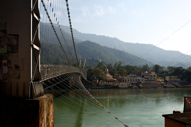 This is Ram Jhula bridge in Rishikesh, India over the river Ganges. A kilometre or two north is a similar bridge named Lakshman Jhula which was built in 1939.