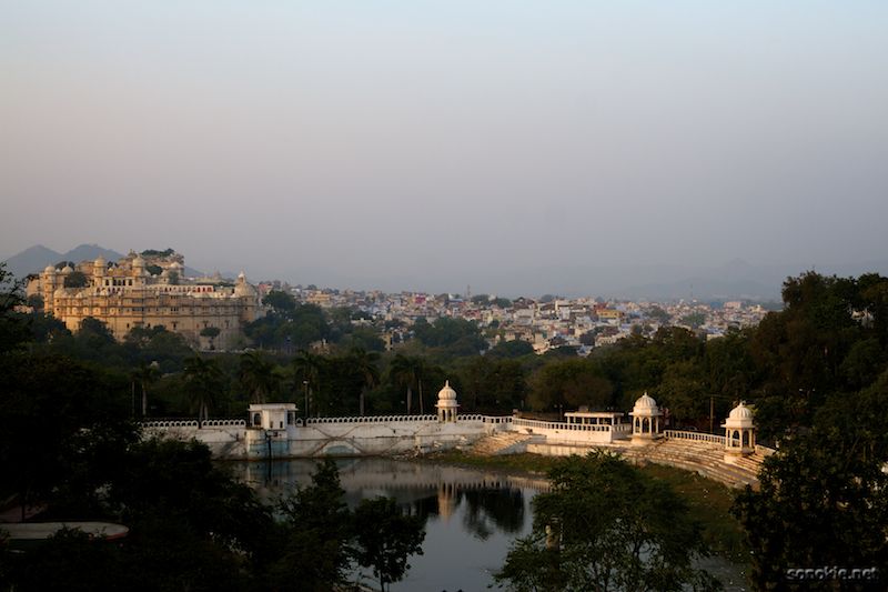 In India, the weather is hot and dry or hot and wet. Since ancient times, they've built 'tanks', which are areas (much like rice paddies) where water collects in the wet seasons for use in the dry seasons. I'm assuming this is such a reservoir because it's right next to the lake. The walls are pretty fancy too, so maybe it was for the use of the palace, which is the building on the left.