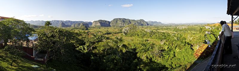 Limestone cliffs overlook the valley of Viñales in western Cuba. On the left, a hotel with pool for tourists; on the right farms and houses for Cubans.