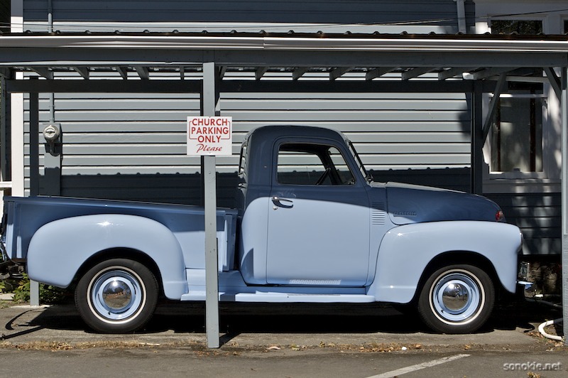 If Jesus came back he wouldn't walk the streets like he did in the old times, he'd have to have a car because he wouldn't be taken seriously without one. So I'd like to know: What Would Jesus Drive? Some probably think he'd drive a Hummer, an SUV or maybe a Porsche. I think he'd drive a baby-blue Chevy just like this and the fact that it's parked in the church parking lot is not a coincidence.